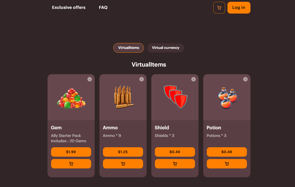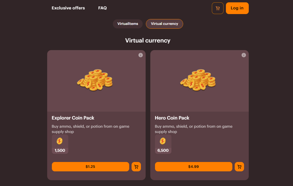 This Web Shop sells virtual currency (Coins and Gems) as well as gameplay consumables such as Ammo, Shields, Potions, and bundle packages. The shop is designed for active players who want faster progression, combat refills, or strategic support through allies. Gems allow players to hire allies such as Shooter, Healer, and Freeze companions.