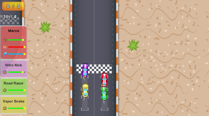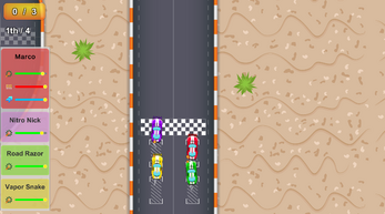 A high-octane, top-down combat racer where the finish line is a luxury and survival is the goal. Armed with front-mounted spikes and a lead foot, tear through Forest, Desert, and Snow tracks. Move using "WASD" or Arrows button